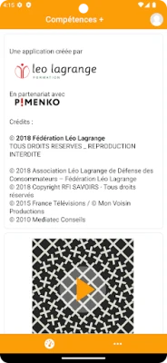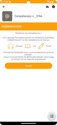 Compétences + est une application linguistique destinée aux personnes qui veulent connaître précisément leur niveau en français. A1 : Débutant A2 : Intermédiaire B1 : Avancé ... Conçue par les experts Léo Lagrange Formation, Compétences + permet de vous tester sur 3 compétences clés : compréhension écrite, réception orale et production écrite. Entraînez-vous grâce à des activités interactives et ludiques sur les thèmes incontournables de la vie quotidienne (culture, santé, commerce...). Évaluez-vous et réalisez le parcours de formation qui vous correspond ! Plus d'information sur : https://www.leolagrange-formation.fr/demo-competencesplus/