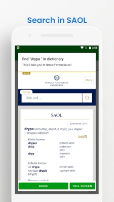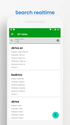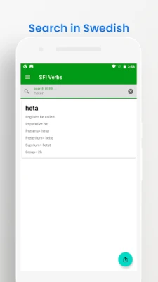 1. More than 2000 basic verbs using in SFI and daily life 2. Offline for use 3. Realtime search by any keywords in both English and Swedish 4. Easy to use. Quick to search your verb and find others 5. Free of charge. 6. For beginner in Swedish, students in SFI class and use with Rivstart textbook 7. Easy search by SAOL