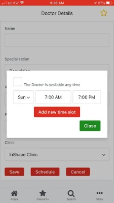 After Installing the application, start by adding working days, specialization, and your products with its prices from the More Screen. After that, you can add your areas, buildings, clinics, and doctors